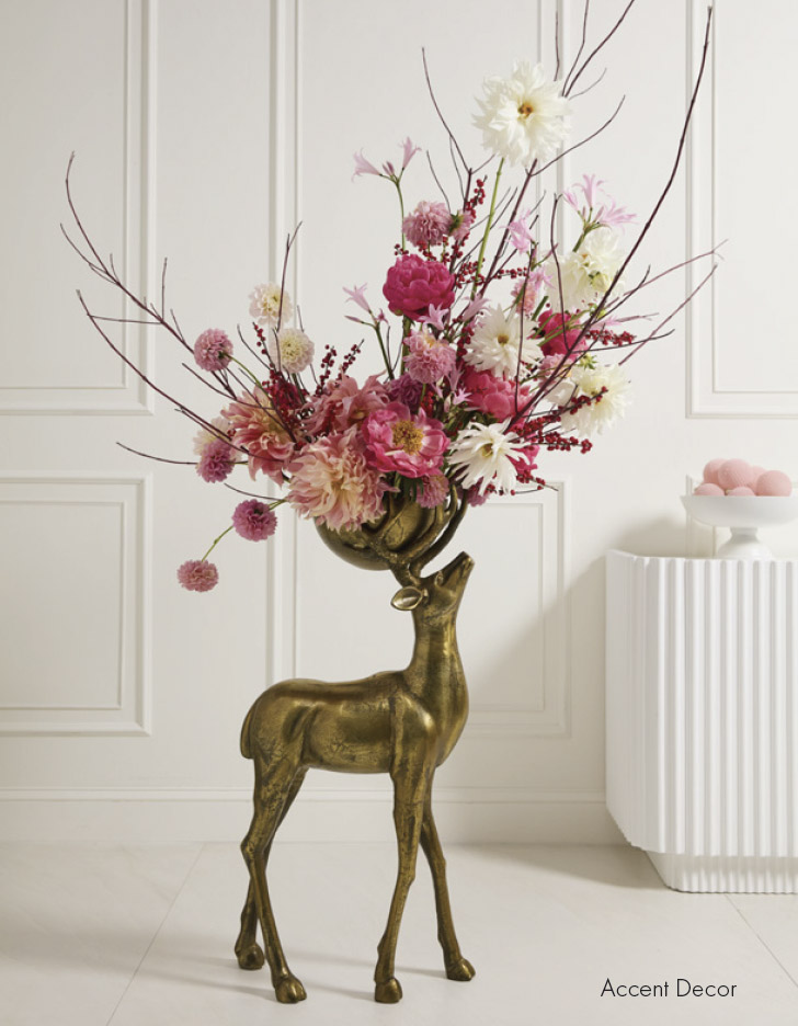 The Accent Decor design team also calls attention to this shift in texture: “We’re seeing wild, organic florals coming back strong. Think asymmetrical shapes, dried elements, pinecones, branches and even upcycled vessels. It’s all about dimension, sustainability and a nod to nature.”