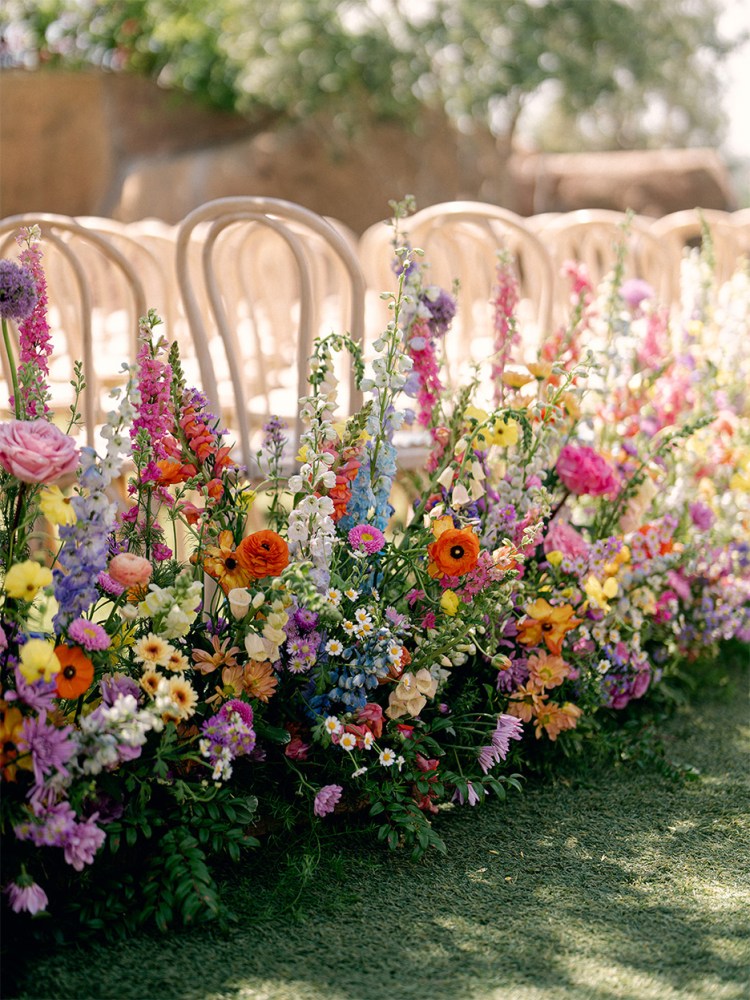 - One of the most common and enchanting trends we’ve been creating recently is the use of “grounded meadows”—lush, organic arrangements of flowers that line the aisle and backs of chairs. These meadows, inspired by the beauty of wildflowers, create a soft, romantic and immersive atmosphere. Some designs feature continuous rows of blooms, while others alternate between varied textures and colors. It’s like they mimic nature’s own rhythm, creating a sense of movement down the aisle. –Katie Noonan, AIFD, CFD, of Noonan’s Wine Country Designs (San Luis Obispo, Calif.)
